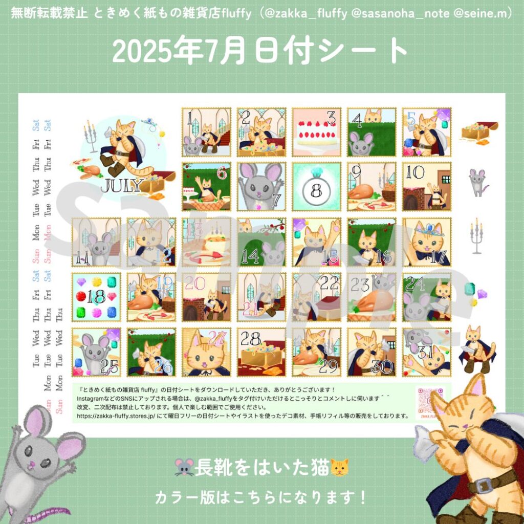 7月の日付シートできました! 今回のテーマは・・・ 長靴をはいた猫 人食い鬼をねずみに変身させ追いかけているシーンとお宝を持ち帰るシーンを日付シートにしました。 2025/07/1 23:59頃まで、ネットプリントで配信 […]