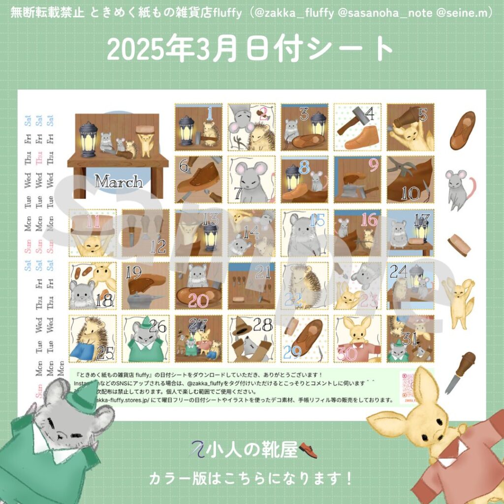 3月の日付シートできました! 今回のテーマは・・・ 小人の靴屋 夜な夜な靴を作る動物の小人たち。お洋服をプレゼントされて嬉しそうに帰っていきました。 2025/03/05 13:00頃まで、ネットプリントで配信中です。! […]