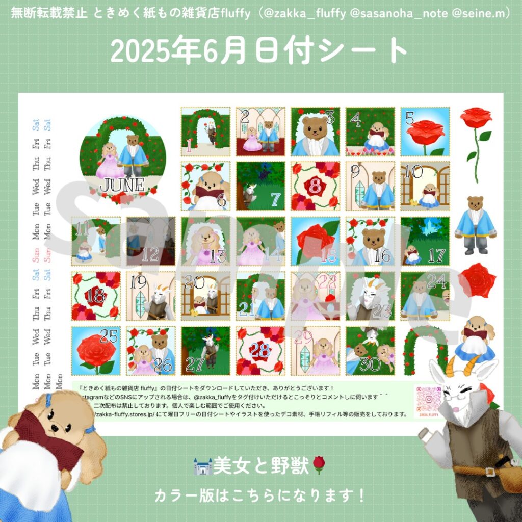 6月の日付シートできました! 今回のテーマは・・・ 美女と野獣 美女のドレスアップ姿と町娘スタイル、野獣と美女のお父さんがバラ園やお城で過ごしています。 2025/05/30 23:59頃まで、ネットプリントで配信中です […]