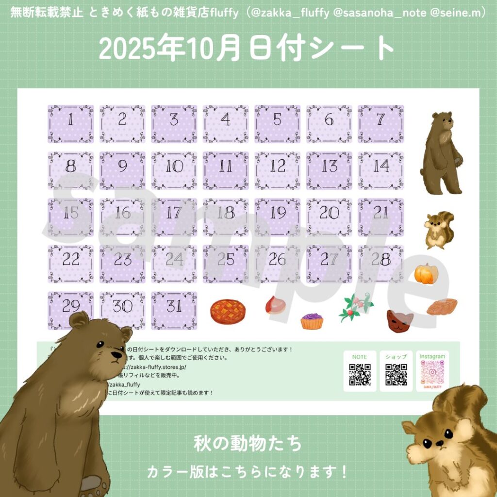 10月の日付シートできました! 実りの秋ということで、森の動物達、美味しい食べ物と紫の日付シートにしました。みなさんの手帳のお供にしていただけたら嬉しいです。 セピア版をNOTEで無料配信中です。カラー版は有料のみとなり […]